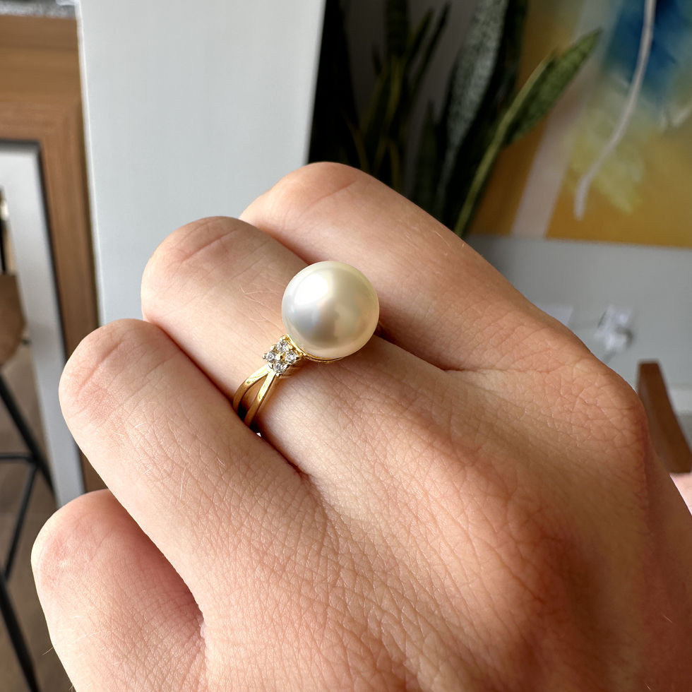 Anel de Pérola com zircônia nas laterais disponível no Banho de Ouro 18k